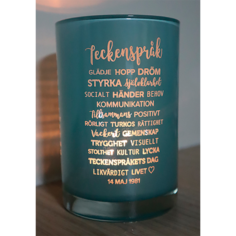 Ljuslykta i turkos färg med silverfärgad insida. Med olika värdeord från dövsamhället.